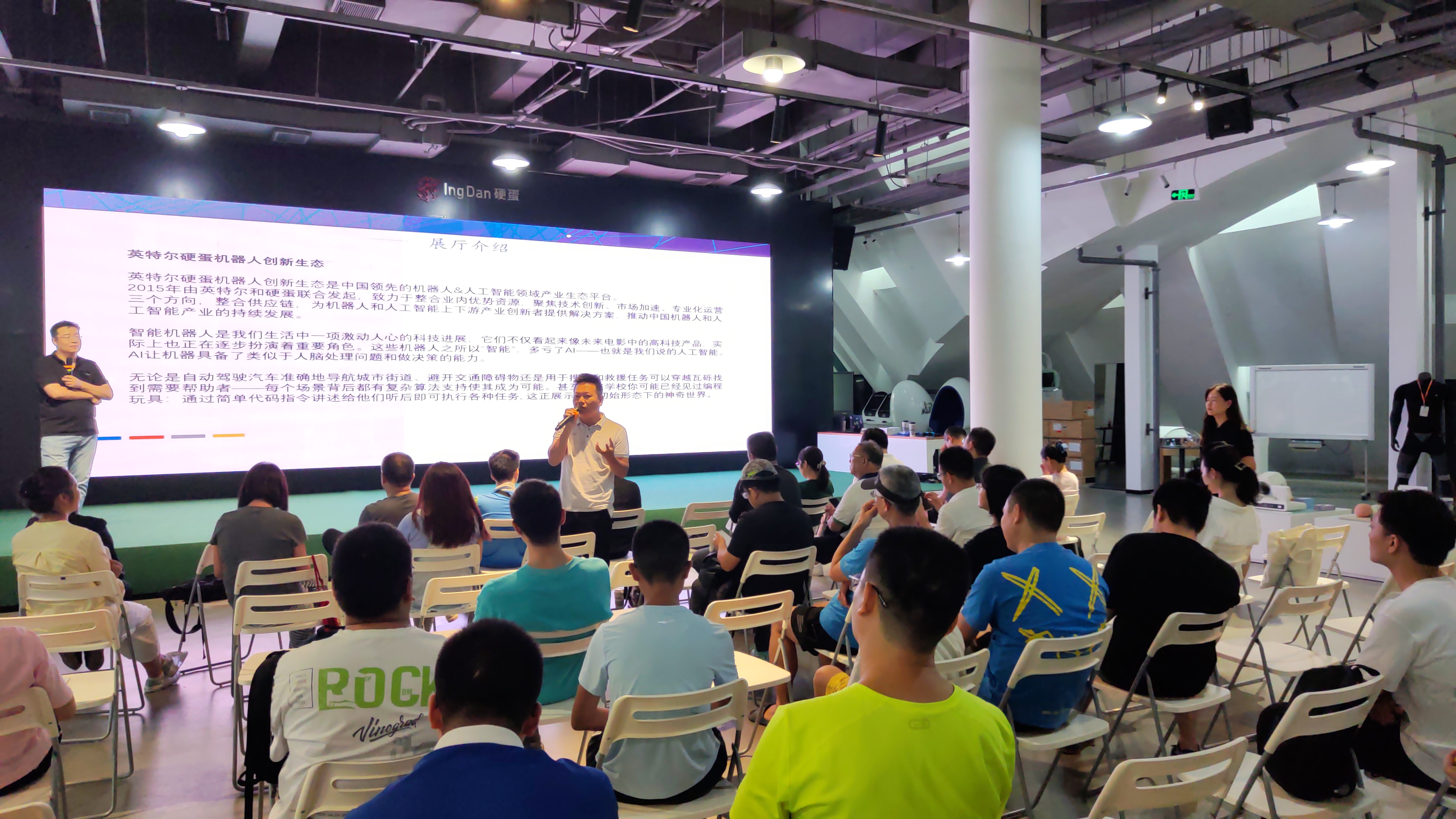 活动的最后,郭鹏举邀请听众参观硬蛋科技创新成果展示区,并介绍硬蛋在AI技术领域的最新研发成果和应用实例,众多听众在展品前驻足,并围绕展品应用进行交流。